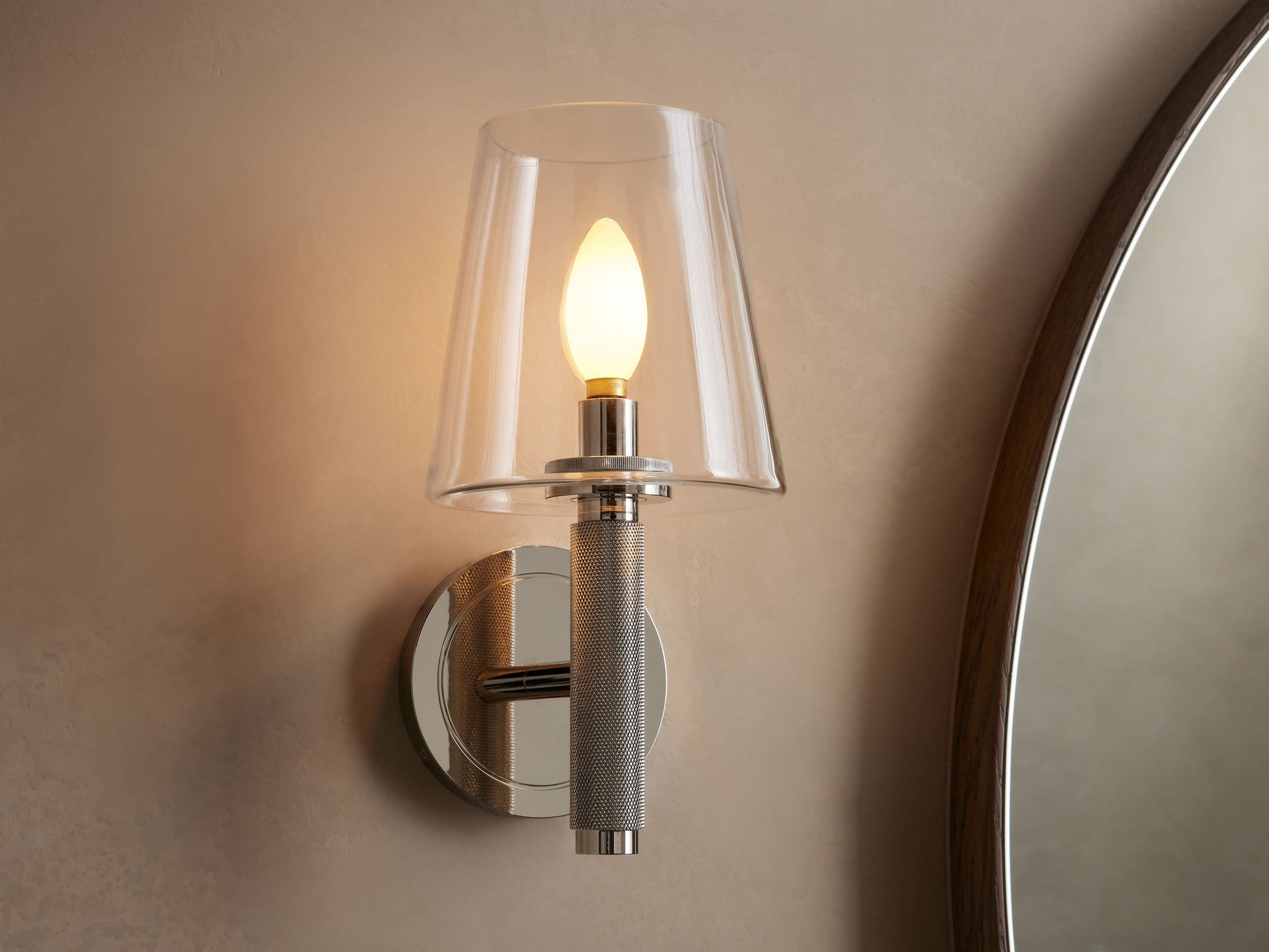 - Crafted from steel in either an antique brass or polished nickel finish with your choice of a clear or milk glass shade.